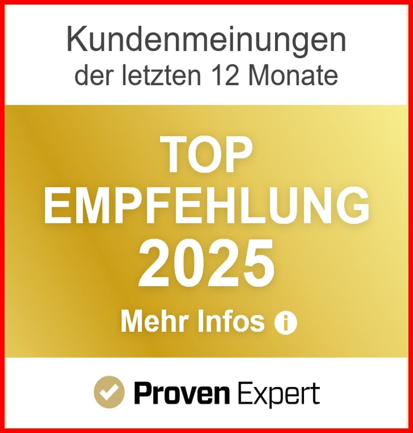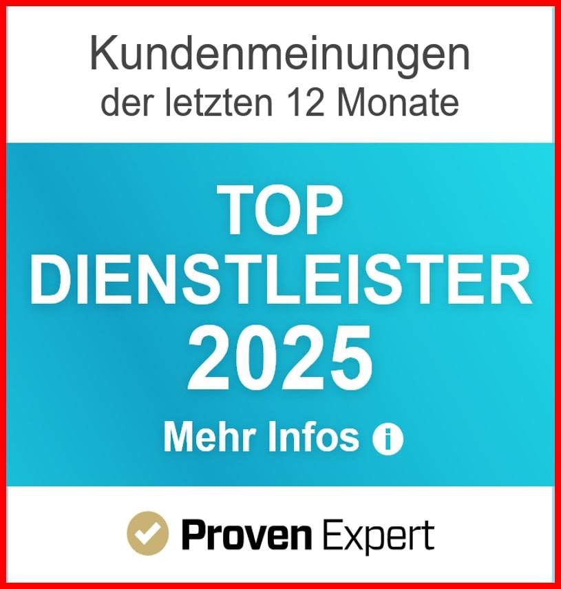 Weil uns bereits über 330 Kundinnen und Kunden auf Google mit der Note „Sehr gut“ bewertet haben. Auch auf ProvenExpert haben wir über 1.500 Bewertungen erhalten – ebenfalls mit Bestnoten „Sehr gut“. Darüber hinaus wurden wir auf mehreren bekannten Portalen durchweg positiv bewertet und konnten uns dort ein hervorragendes Vertrauen erarbeiten. Unsere Servicequalität wurde mehrfach als Top-Dienstleister ausgezeichnet. Bei uns erleben Sie persönlichen Kundenservice auf Augenhöhe, ohne versteckte Kosten.