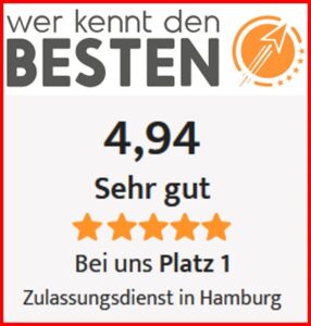 DKK24 KFZ Zulassungsservice Zulassungsdienst Zulassungsstelle Hamburg ist seit über 15 Jahren Ihr zuverlässiger KFZ Zulassungsservice in Hamburg und bundesweit und bietet als erfahrener Zulassungsdienst schnelle und professionelle Abläufe, mit über 20 Jahren Expertise in der Fahrzeugzulassung. Unser Service wurde mehrfach ausgezeichnet: FOCUS Online empfiehlt den DKK24 Zulassungsservice, bei ProvenExpert erhielten wir 2020, 2023 und 2025 die Auszeichnungen „Top Dienstleister“ und „Top Empfehlung“ sowie über 1.600 Bewertungen mit der Note „Sehr gut“. Auf Google bewerten uns mehr als 350 Kunden ebenfalls mit „Sehr gut“. Beim Portal „Wer kennt den Besten“ belegen wir Platz 1 in Hamburg. Zusätzlich sind wir DIN-zertifiziert und zählen zu den bestbewerteten Zulassungsstellen in Hamburg.